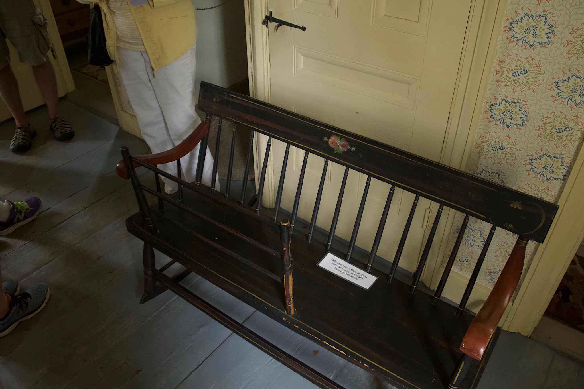 A “Nanny bench”, with seating for the adult on the right, and an enclosed area on the left for a baby Published June 21, 2018 at 2048 × 1365 in 2018 Quechee Balloon Festival, Vermont The bed where Coolidge was born